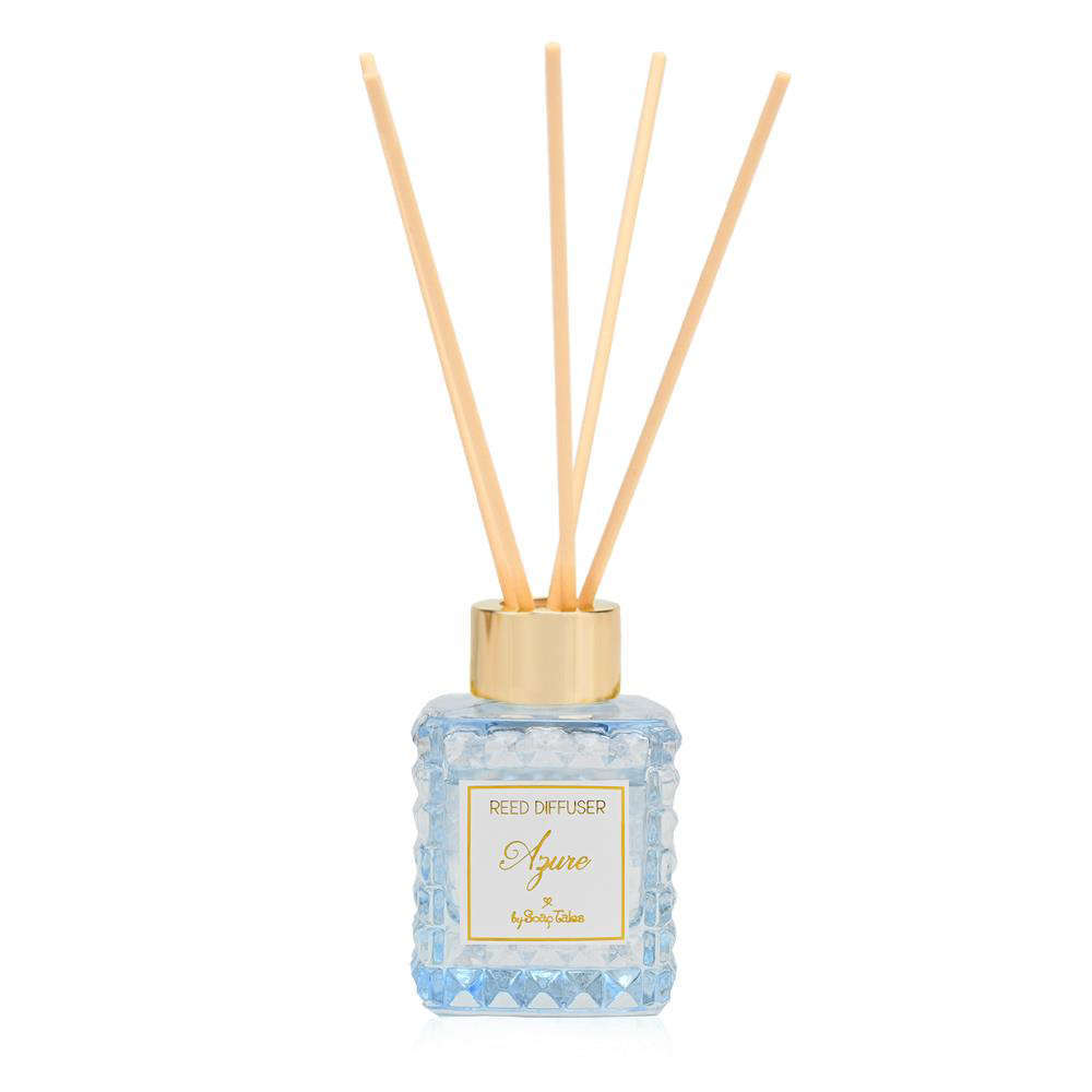 Το αρωματικό χώρου azure της SoapTales είναι μια εκλεπτυσμένη πρόταση που συνδυάζει καθαρότητα, απαλότητα και διακριτική πολυτέλεια. Το γυάλινο μπουκάλι με ανάγλυφη υφή και χρυσό καπάκι χαρίζει μια κομψή παρουσία, ιδανική για elegant διακόσμηση αλλά και για ιδιαίτερες περιστάσεις.