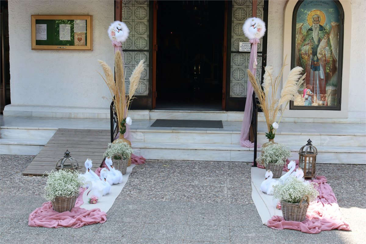 Στολισμός εκκλησίας για βάπτιση με θέμα κύκνος boho, candy bar με θεματικά γλυκά