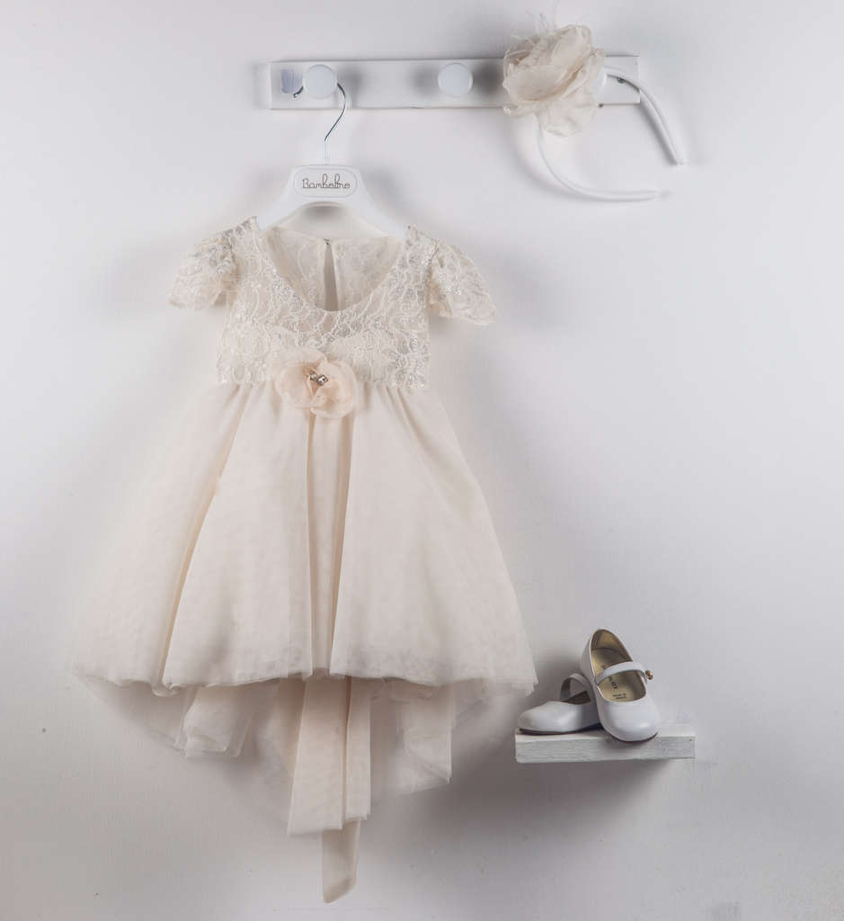 Η Ophelia είναι ένα αέρινο ασύμμετρο φόρεμα βάπτισης με μανίκι από εξαιρετική γαλλική δαντέλα και τούλι soft touch. Το φόρεμα στολίζεται με handmade λουλούδι στο χρώμα της πούδρας , αξεσουάρ για το κεφάλι, στέκα με λουλούδια από οργάντζα και κρύσταλλα.