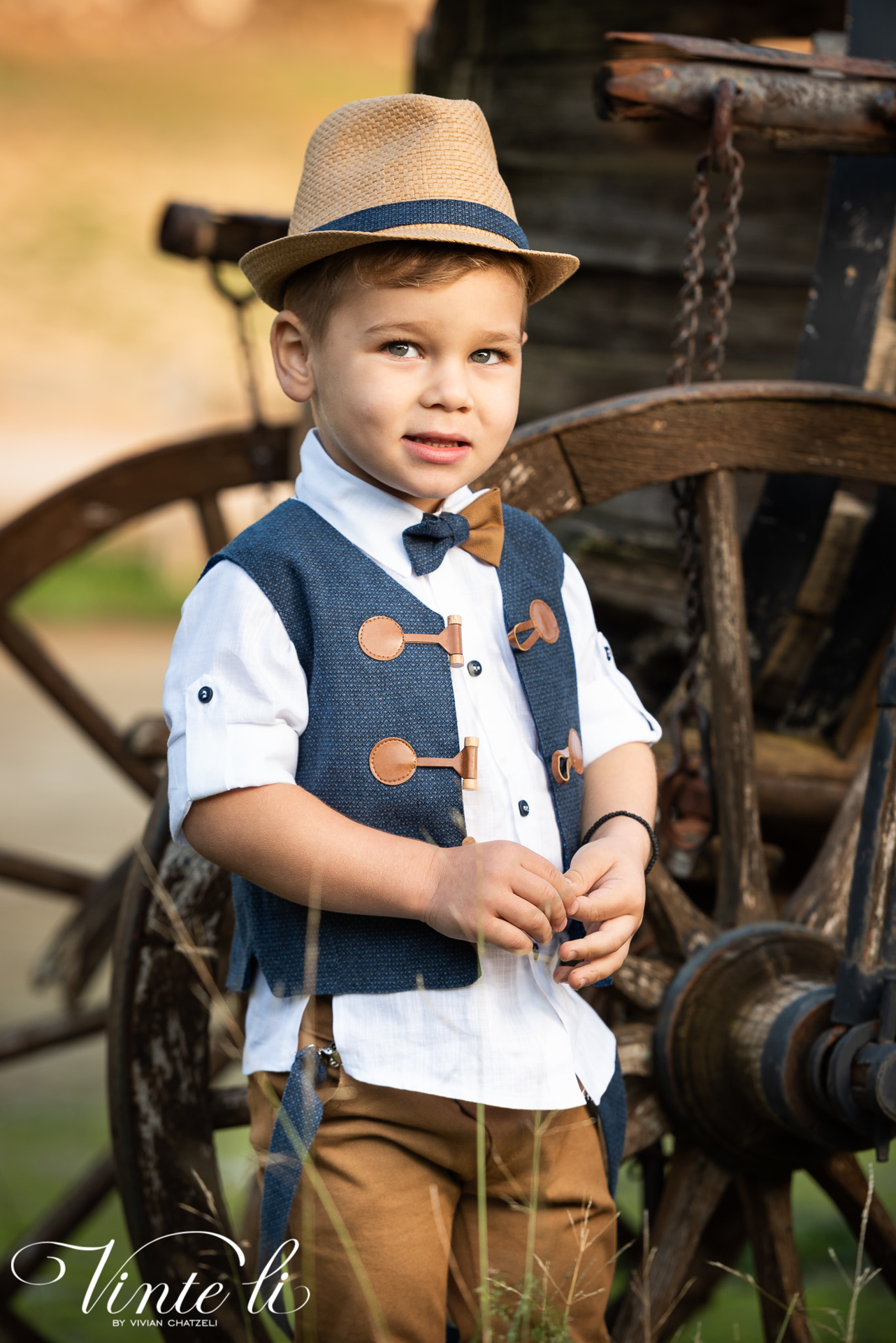 Trois-pièces με μπλε γιλέκο, λευκό πουκάμισο και ταμπά παντελόνι. Συνοδεύεται από παπιγιόν, τιράντες και ψάθινο καβουράκι. Σετ 6 τεμαχίων.