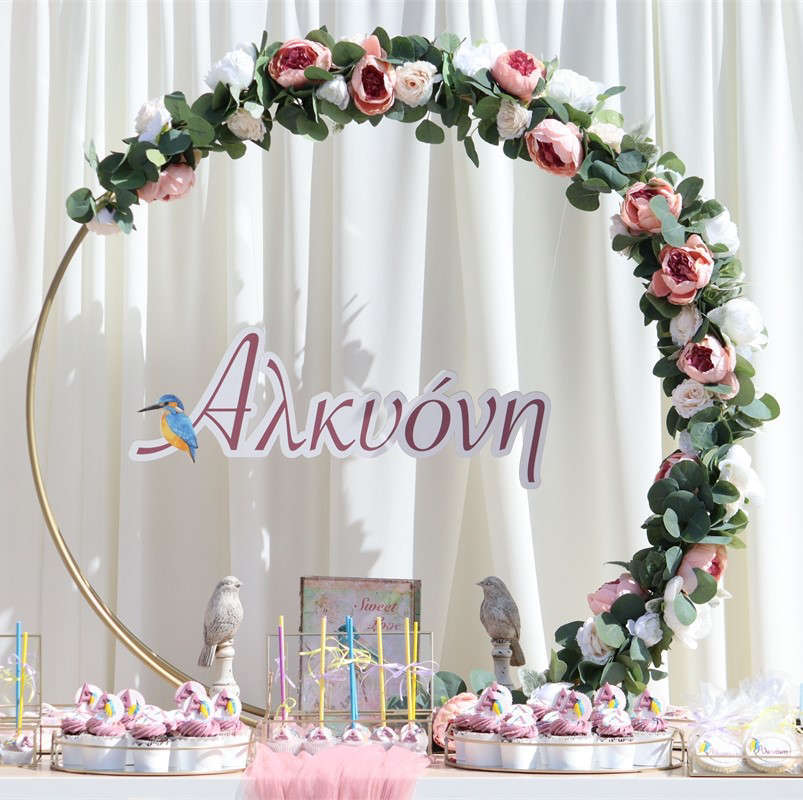 Η βάπτιση με θέμα την Αλκυόνη συνδυάζει την κομψότητα με τη φύση, δημιουργώντας ένα σκηνικό γεμάτο φως και χρώμα. Το κεντρικό Candy Bar πλαισιώνεται από ένα χρυσό μεταλλικό στεφάνι στολισμένο με ευκάλυπτο, λευκά και ροζ άνθη, ενώ στο κέντρο δεσπόζει το όνομα της μικρής σας σε custom κοπή. Η παρουσίαση περιλαμβάνει μια μεγάλη ποικιλία από θεματικά κεράσματα, όπως cupcakes με κρέμα, δίχρωμα cake pops και λαχταριστά μπισκότα, όλα τοποθετημένα σε πολυτελείς χρυσές βάσεις και ξύλινες επιφάνειες που ενισχύουν το chic αποτέλεσμα.