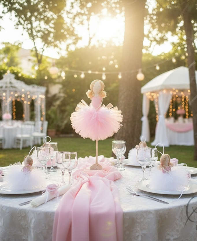Αναδείξτε τη διακόσμηση της δεξίωσής σας με αυτή την ονειρική χειροποίητη κούκλα, σχεδιασμένη για να αποτελέσει το κεντρικό σημείο αναφοράς (centerpiece) σε κάθε τραπέζι. Με αέρινη φούστα από πλούσιο ροζ τούλι και προσεγμένες λεπτομέρειες, η φιγούρα αυτή προσδίδει μια αίσθηση κομψότητας και παιδικής αθωότητας στον χώρο. Συνδυάζεται άψογα με runners σε παστέλ αποχρώσεις και λευκά τραπεζομάντηλα, δημιουργώντας ένα ολοκληρωμένο, θεματικό σκηνικό που μεταμορφώνει την ατμόσφαιρα της βάπτισης σε ένα πραγματικό παραμύθι.