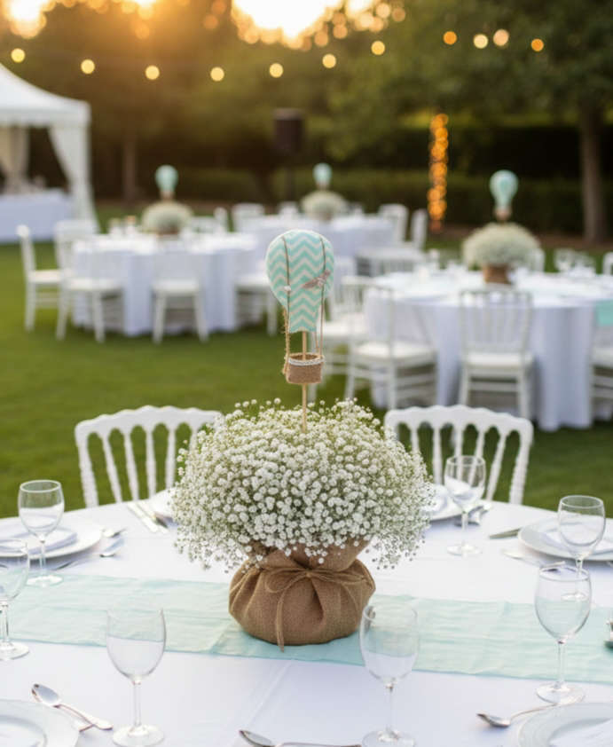 Μπομπονιέρα βάπτισης με υφασμάτινο αερόστατο και λεπτό καλαθάκι από λινάτσα (τα κουφέτα κρέμονται έξω απο το καλαθάκι), σε ποικιλία σχεδίων και χρωμάτων. Η μπομπονιέρα είναι κρεμαστή και μπορεί να διακοσμήσει παιδικό δωμάτιο