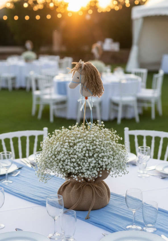 Αυτό το χειροποίητο centerpiece αποτελεί την τέλεια επιλογή για μια βάπτιση με κλασική και ρουστίκ αισθητική, προσφέροντας μια αίσθηση ζεστασιάς και φροντίδας στον χώρο σας. Η σύνθεση περιλαμβάνει πλούσια λευκή γυψοφίλη μέσα σε ένα χειροποίητο πουγκί από φυσική λινάτσα, το οποίο κοσμείται από ένα μοναδικό υφασμάτινο αλογάκι σε στικ, δημιουργώντας ένα τρυφερό και παιχνιδιάρικο αποτέλεσμα. Σχεδιασμένο για να αναδεικνύει τις ροτόντες σε εξωτερικούς ή εσωτερικούς χώρους δεξιώσεων, αυτό το διακοσμητικό συνδυάζει την απλότητα των φυσικών υλικών με την υψηλή ποιότητα των handmade δημιουργιών, εξασφαλίζοντας έναν ονειρεμένο στολισμό για τη μέρα του μικρού σας πρωταγωνιστή.