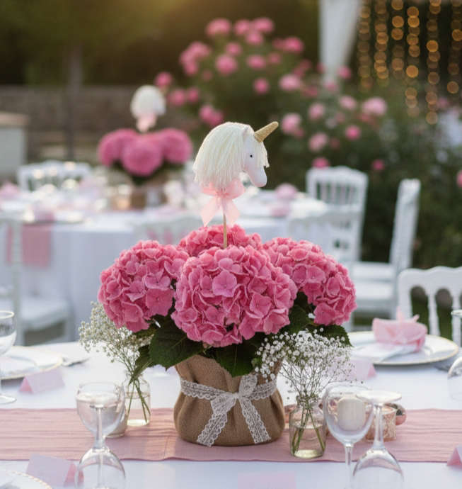 Προσθέστε μια δόση μαγείας στη δεξίωση της βάπτισής σας με αυτό το χειροποίητο centerpiece «Μονόκερος». Η σύνθεση συνδυάζει την εντυπωσιακή ομορφιά της ροζ ορτανσίας με ένα ρουστίκ πουγκί από φυσική λινάτσα, ενώ ο υφασμάτινος μονόκερος με τις πολύχρωμες λεπτομέρειες πάνω σε στικ αποτελεί την πιο γλυκιά πινελιά για τον στολισμό του τραπεζιού. Ιδανικό για ροτόντες σε εξωτερικούς ή εσωτερικούς χώρους, αυτό το διακοσμητικό φέρνει στη ζωή έναν κόσμο φαντασίας, προσφέροντας μια μοναδική, handmade αισθητική που ταιριάζει απόλυτα στην πιο ξεχωριστή ημέρα της μικρής σας.