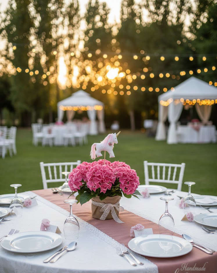 Αυτό το χειροποίητο centerpiece φέρνει τη μαγεία του παραμυθιού στη δεξίωσή σας, αποτελώντας την ιδανική επιλογή για τον κεντρικό στολισμό των τραπεζιών σας. Η σύνθεση συνδυάζει την πολυτέλεια της ροζ ορτανσίας με έναν υπέροχο, χειροποίητο υφασμάτινο μονόκερο με χρυσό κέρας και φλοράλ λεπτομέρειες. Το κασπώ από φυσική λινάτσα και η φίνα δαντέλα προσδίδουν μια ρουστίκ αλλά κομψή αισθητική, δημιουργώντας ένα μοναδικό οπτικό αποτέλεσμα που θα ενθουσιάσει τους καλεσμένους σας και θα δώσει μια ξεχωριστή λάμψη σε κάθε τραπέζι της βάπτισης.