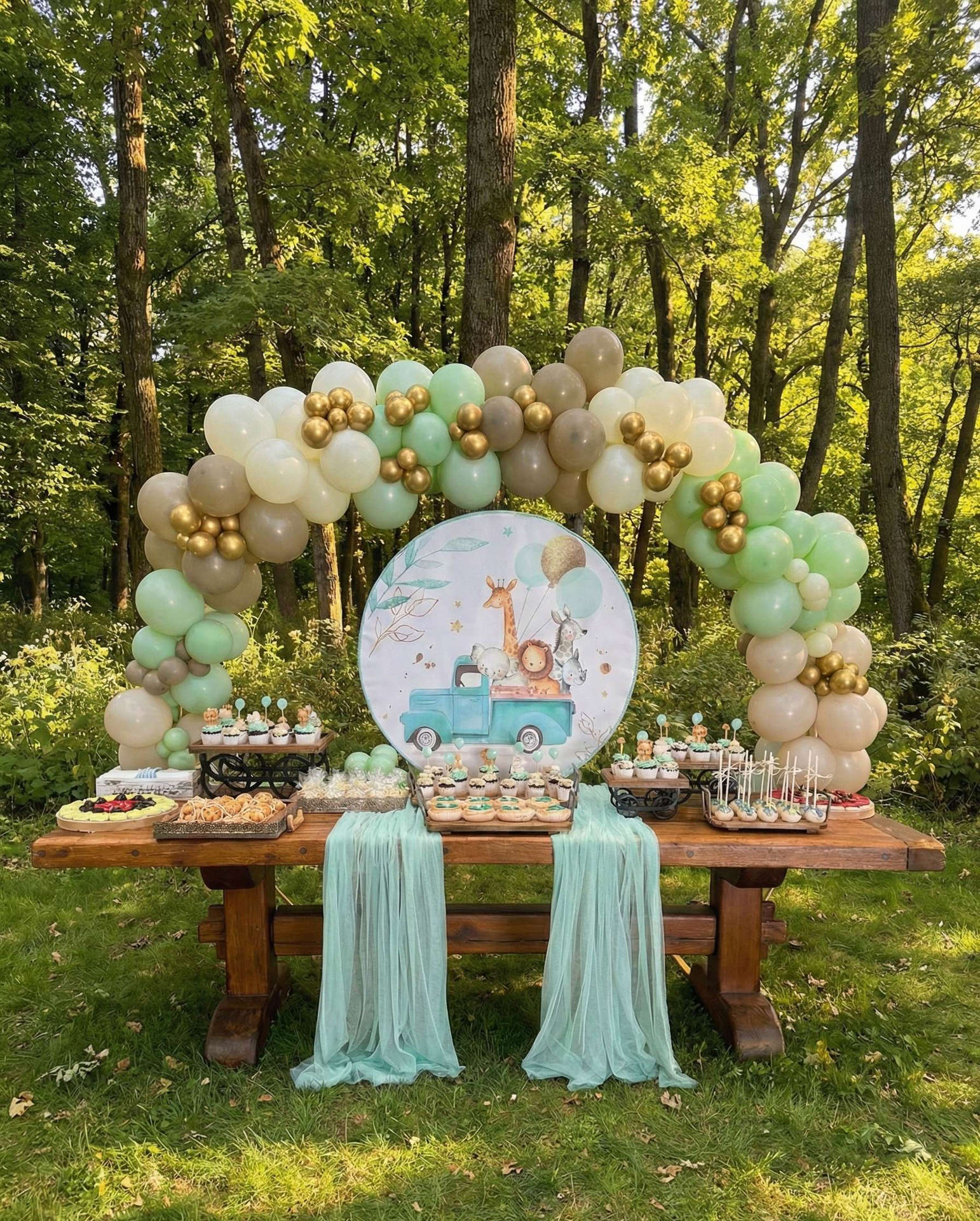 Η σύνθεση κυριαρχείται από ένα ρουστίκ ξύλινο τραπέζι στολισμένο με αέρινα υφάσματα σε απόχρωση μέντας και πλαισιώνεται από μια πλούσια, οργανική γιρλάντα μπαλονιών σε λαδί, μπεζ και χρυσούς τόνους. Το κεντρικό στρογγυλό backdrop απεικονίζει χαριτωμένα ζωάκια της ζούγκλας πάνω σε ένα vintage φορτηγάκι, δημιουργώντας το τέλειο φόντο για τις φωτογραφίες σας, ενώ τα θεματικά γλυκά ολοκληρώνουν την αισθητική εμπειρία