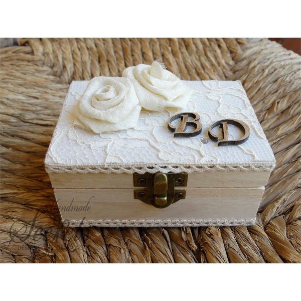 Ξύλινο κουτί για βέρες διακοσμημένο με χειροποίητα εκρού τριαντάφυλλα και ξύλινα μονογράμματα.