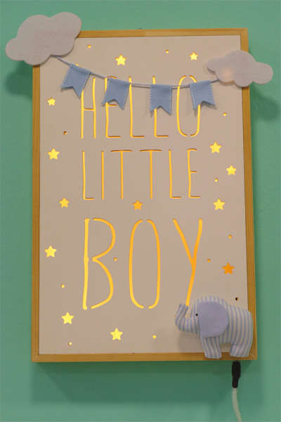 Φωτιστικό νυκτός "Hello Little Boy" με χειροποίητο υφασμάτινο ελεφαντάκι, συννεφάκια και σημαιάκια