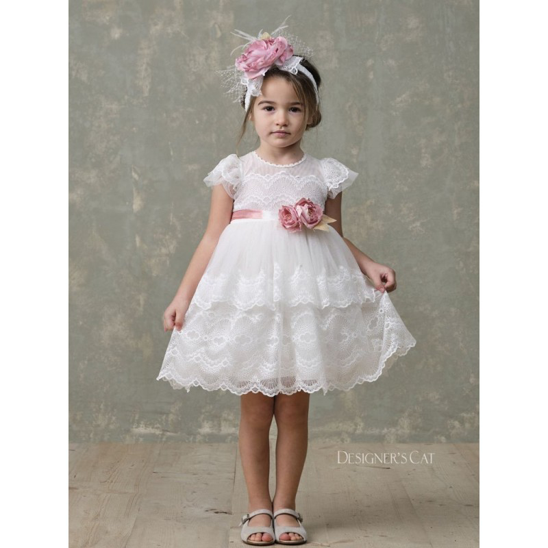 Φόρεμα vintage από εξαιρετικό τούλι και γαλλική δαντέλα στο μπούστο και τα τελειώματα. Διακοσμημένο με χειροποίητα λουλούδια σε απόχρωση του pink. Εσωτερικά είναι επενδυμένο με ύφασμα 100% βαμβάκι. Ένα μοναδικό σύνολο για αέρινες εμφανίσεις
