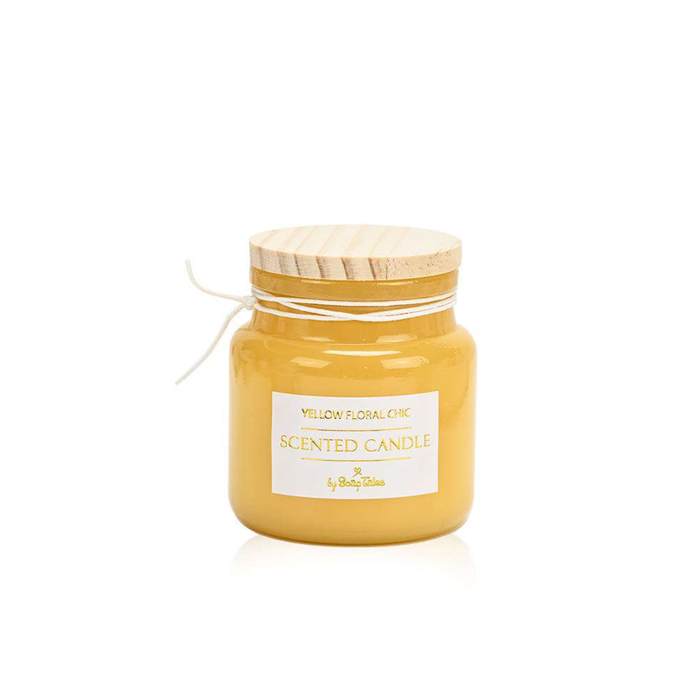 Ανακαλύψτε το μοναδικό κερί της SoapTales σε ζεστό κίτρινο χρώμα, με φυσικό ξύλινο καπάκι.