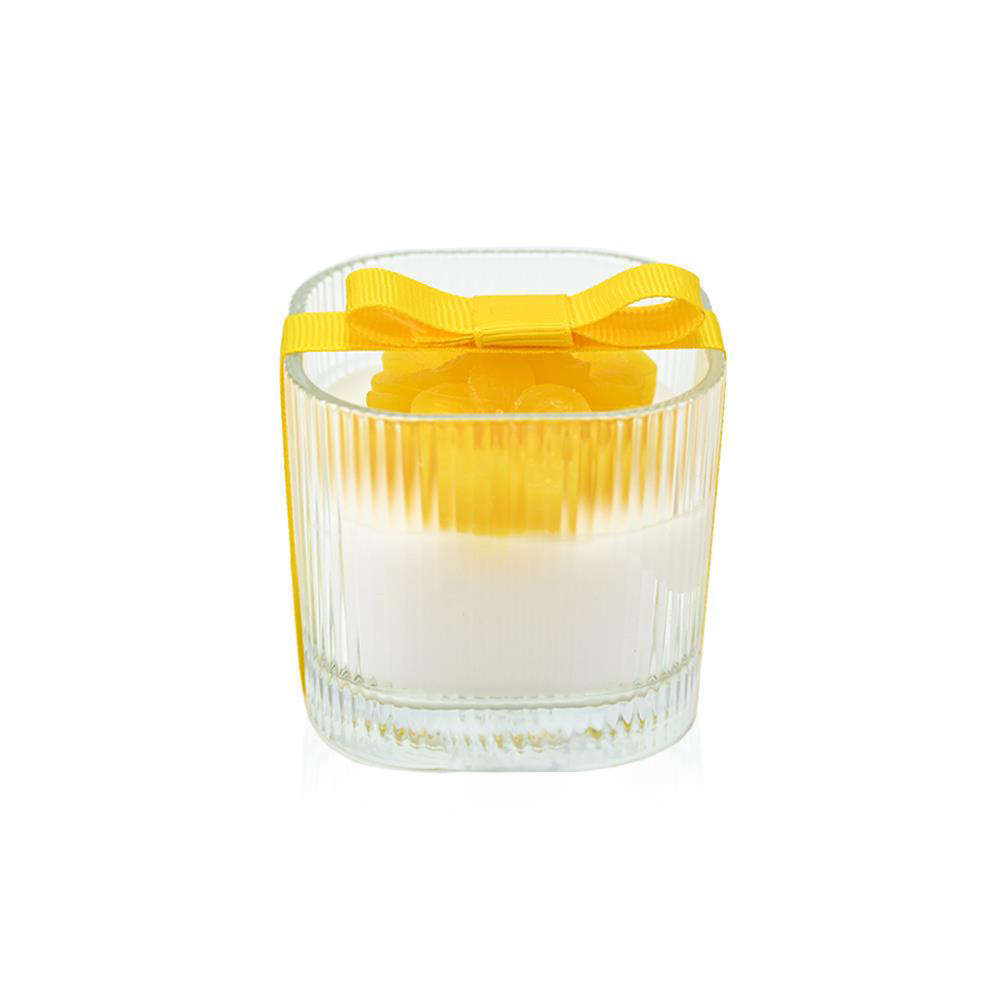 Αρωματικό κερί 120g σε κομψό γυάλινο βαζάκι, διακοσμημένο με ανάγλυφο κερί-λουλούδι στο επάνω μέρος.