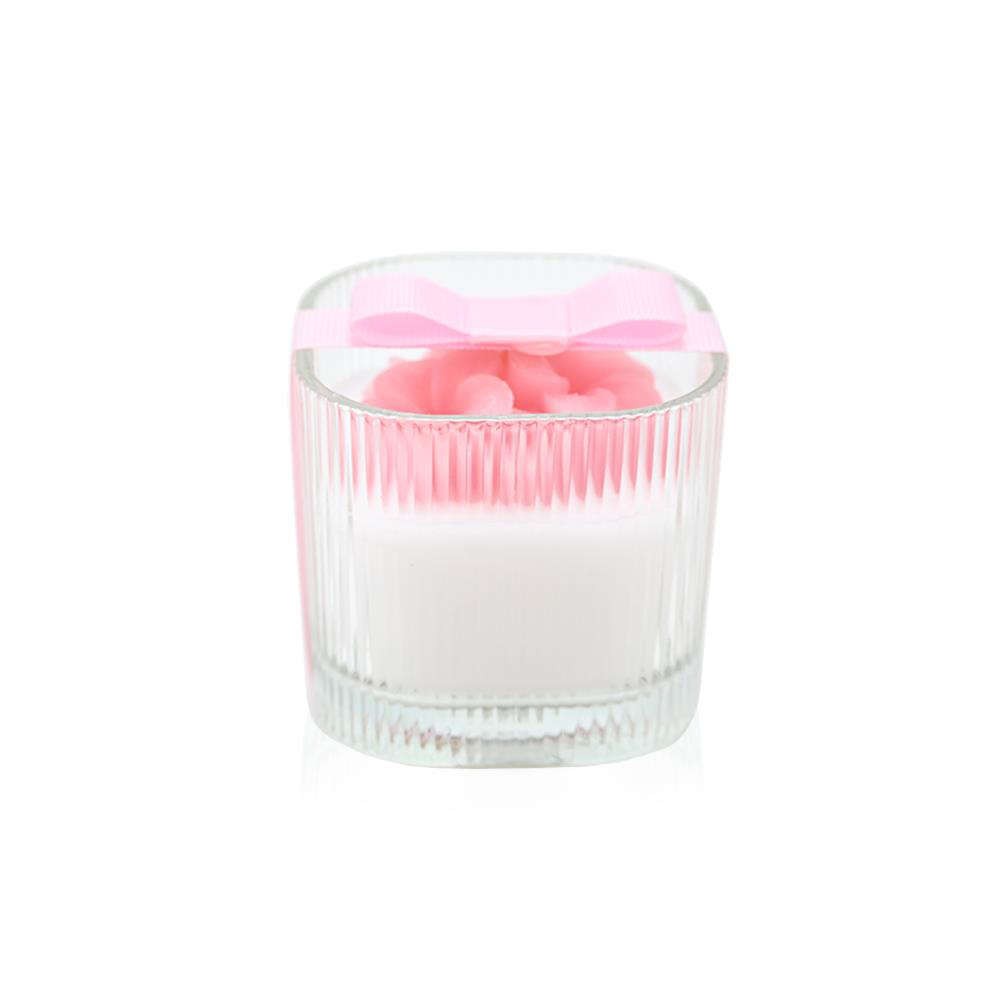 Η ροζ κορδέλα που το αγκαλιάζει ολοκληρώνει το σύνολο με ρομαντισμό και λεπτότητα, κάνοντάς το ιδανικό για μπομπονιέρα ή δώρο.Ένα κερί που μαγνητίζει το βλέμμα και χαρίζει ατμόσφαιρα γλυκιάς κομψότητας.