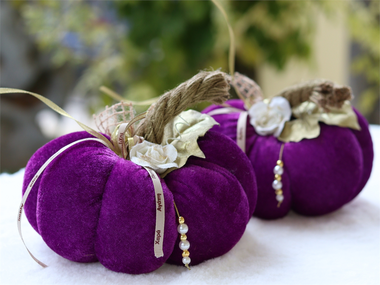 Υφασμάτινη κολοκύθα διακοσμημένη με κορδέλα και λουλούδι.