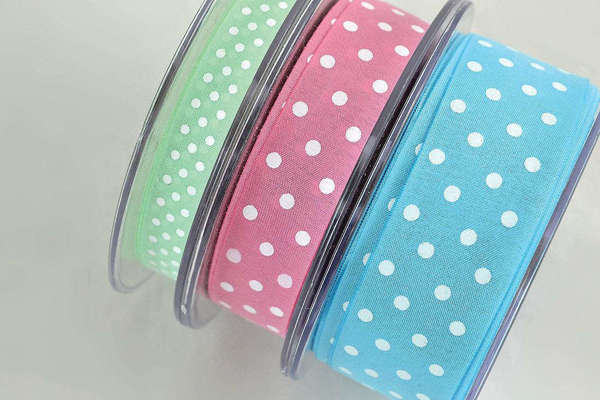 Κορδέλα πολυεστερική χρωματιστή με λευκή εκτύπωση μεταξοτυπίας πουα, χωρίς τελείωμα, σε 18 αποχρώσεις