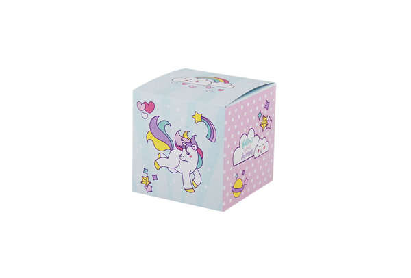 Χάρτινο κουτί κύβος τυπωμένο με θέμα τον μονόκερο. Προτείνεται για μπομπονιέρα. Συναρμολογείται από τον πελάτη.