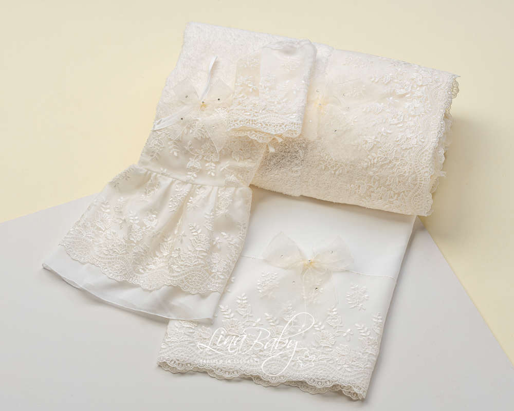 Βαμβακερό σετ λαδόπανου σε δύο χρώματα λευκό και εκρού με εντυπωσιακή γαλλική δαντέλα και φιόγκο από οργαντίνα με στρας.
