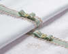 Βαμβακερό σετ λαδόπανων σε λευκό χρώμα με ιδιαίτερη τρέσα από ζικ-ζακ κορδόνια στο χρώμα του σπάγκου και έξτρα τρέσα στο χρώμα της μέντας. Ένα φιογκάκι από την ίδια τρέσα με κουμπάκι στο ίδιο χρώμα ολοκληρώνει την διακόσμηση.