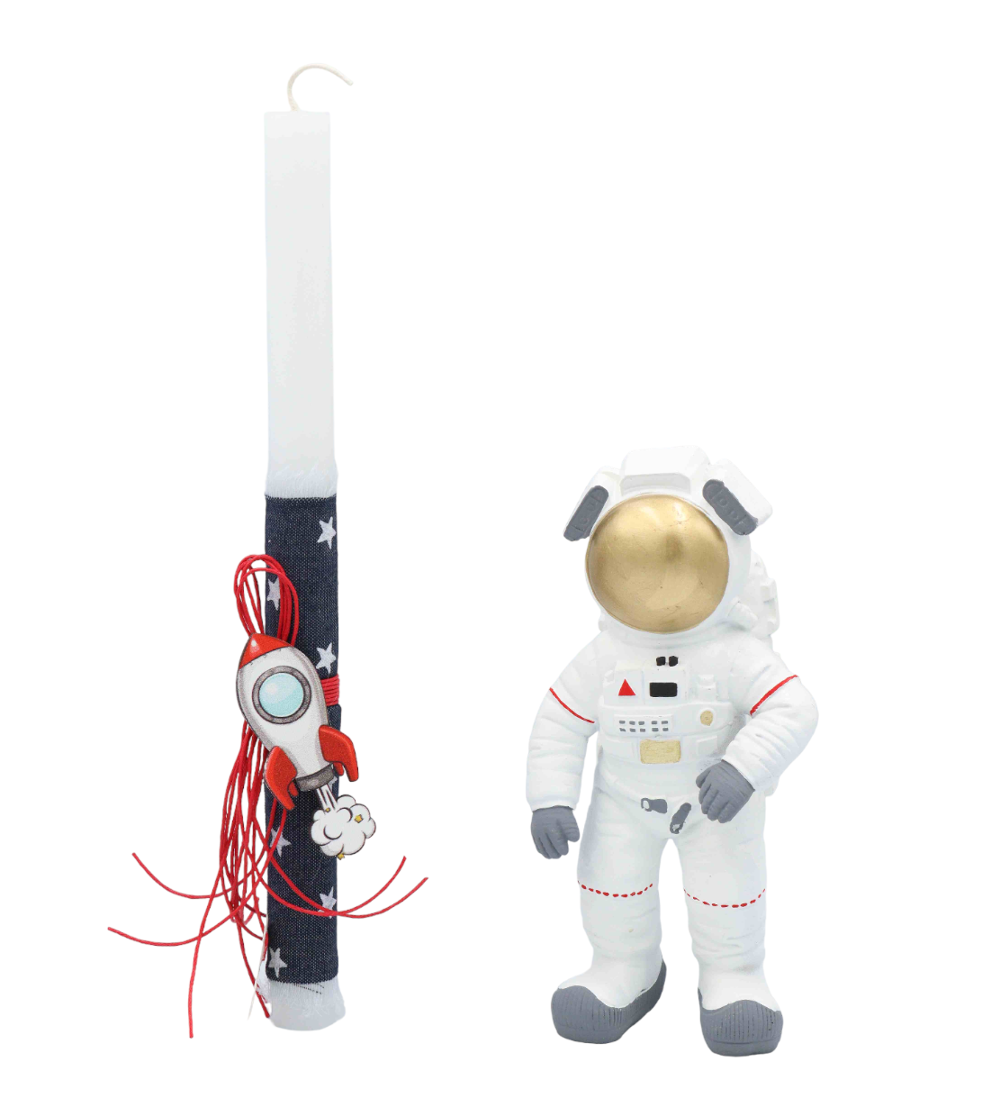 Πασχαλινή λαμπάδα για αγόρια με διακοσμητικό αστροναύτη και ξύλινο μαγνητάκι πύραυλο.