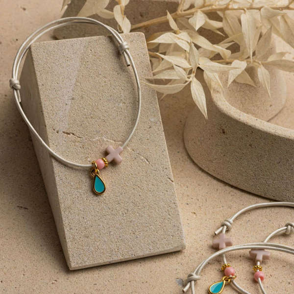 Μαρτυρικό βραχιόλι με μεταλλικό λευκό περλέ κορδόνι μοτίφ σταγόνα επιχρυσωμένη 24Κ