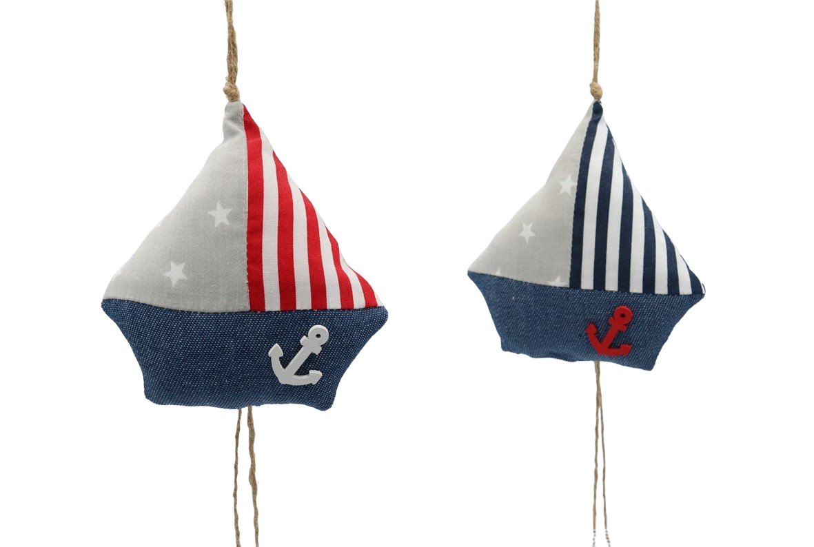 Μπομπονιέρα βάπτισης για αγοράκι, με υφασμάτινο χειροποίητο καραβάκι και ξύλινη άγκυρα. Η μπομπονιέρα είναι κρεμαστή και μπορεί να διακοσμήσει παιδικό δωμάτιο