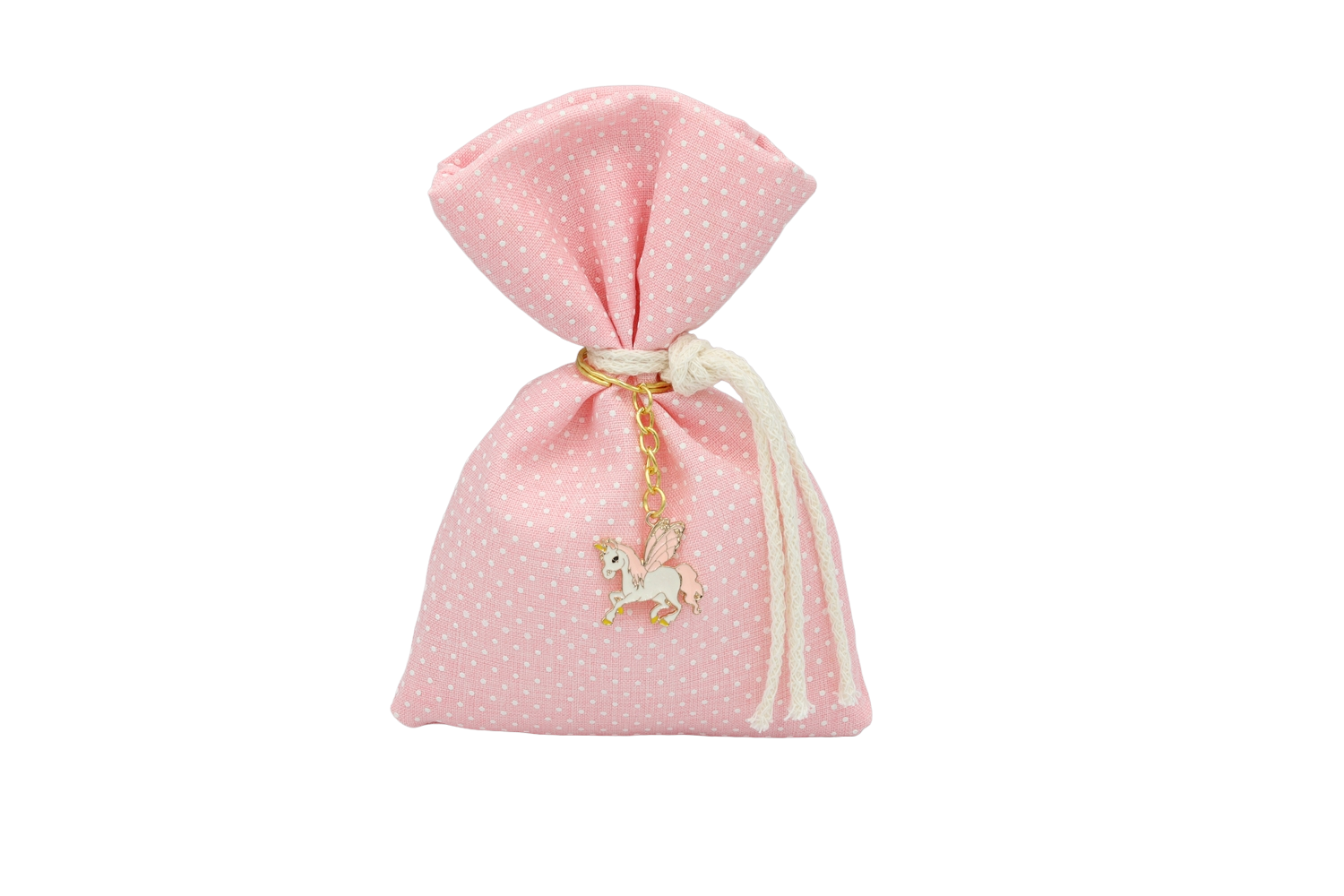 Μπομπονιέρα βάπτισης για κορίτσι, υφασμάτινο πουά πουγκί με δέσιμο από βαμβακερό κορδόνι και μεταλλικό μπρελόκ μονόκερο
