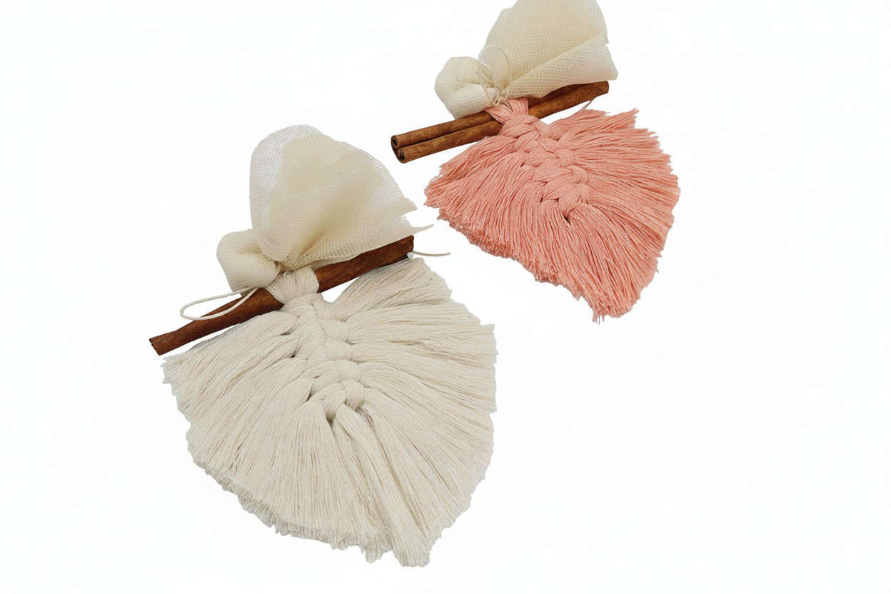Μπομπονιέρα γάμου ή βάπτισης μακραμέ κρεμασμένο πάνω σε φυσικό ξύλο κανέλας σε 2 χρώματα: εκρού και ροζ