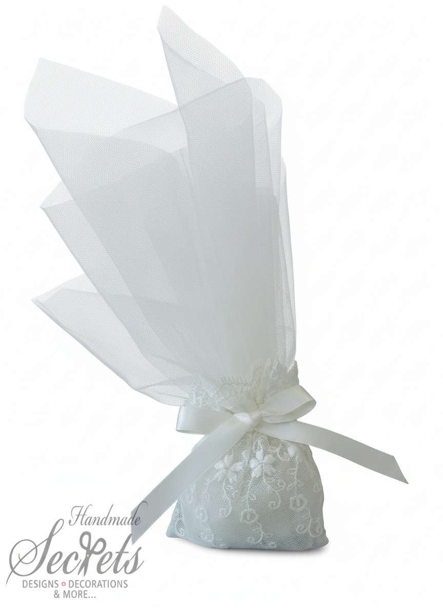 Μπομπονιερα γαμου πουγκι δαντελα μαργαριτα