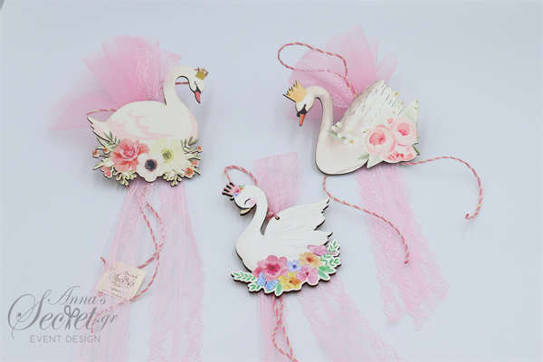 Θεματική μπομπονιέρα βάπτισης για κορίτσι, ξύλινη φιγούρα με θέμα τον κύκνο, κρεμαστή με δίχρωμο σπάγκο και δαντέλα σε ροζ αποχρώσεις. Υπάρχει η δυνατότητα να προστεθεί και μαγνητάκι στην ξύλινη φιγούρα