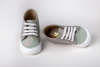 Παπουτσάκι αγκαλιάς χαμηλό δετό από λευκό δέρμα, γκρι ύφασμα και μέντα ύφασμα με μοτίβο. Νούμερα 16-19