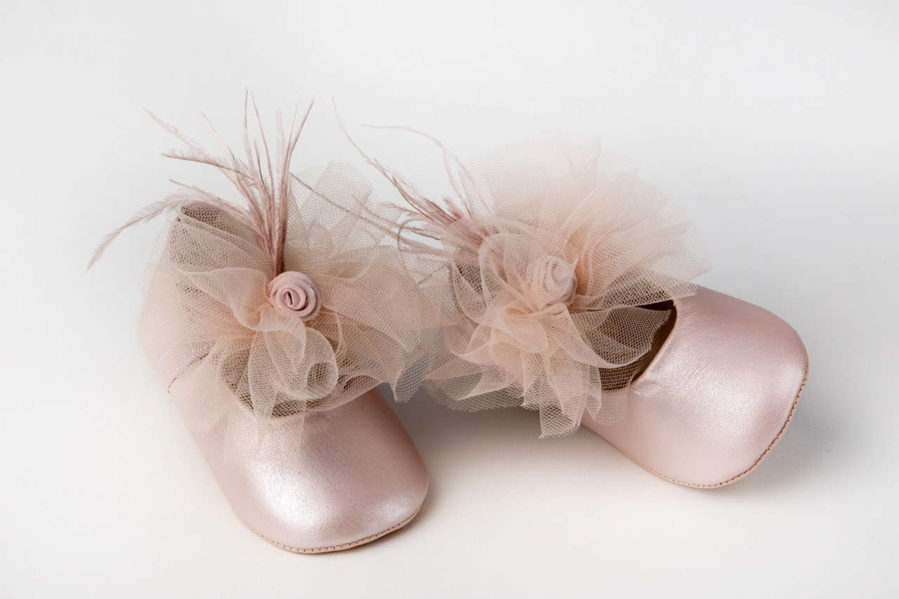 Μπαλαρίνα αγκαλιάς από dusty pink δέρμα, διακοσμημένη με dusty pink τούλι φτερά και τριανταφυλλάκι, κλείσιμο με Velcro. Νούμερα 16-19