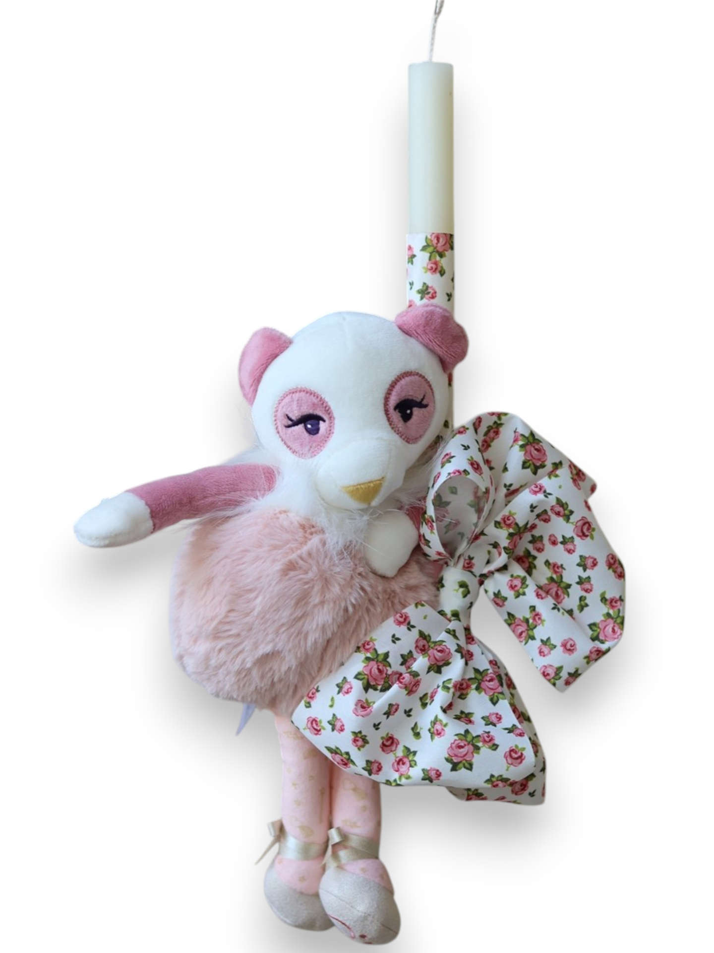 Χαρίστε στο βαφτιστήρι σας την πιο γλυκιά και παιχνιδιάρικη χειροποίητη πασχαλινή λαμπάδα, διακοσμημένη με ένα αξιαγάπητο λούτρινο πάντα σε λευκές και απαλές ροζ αποχρώσεις. Η λευκή λαμπάδα εντυπωσιάζει χάρη στον μεγάλο, πλούσιο φιόγκο από ύφασμα με ρομαντικό φλοράλ μοτίβο από ροζ τριαντάφυλλα, λεπτομέρεια που επαναλαμβάνεται και στο πάνω μέρος της. Το λούτρινο ζωάκι ξεχωρίζει για τη φουντωτή ροζ κοιλίτσα του, τα μακριά ποδαράκια και τα κομψά παπουτσάκια με τις κορδελίτσες. Μια παραμυθένια επιλογή που θα ενθουσιάσει κάθε μικρό κορίτσι και θα της μείνει ως ένα υπέροχο παιχνίδι-ενθύμιο μετά την Ανάσταση.