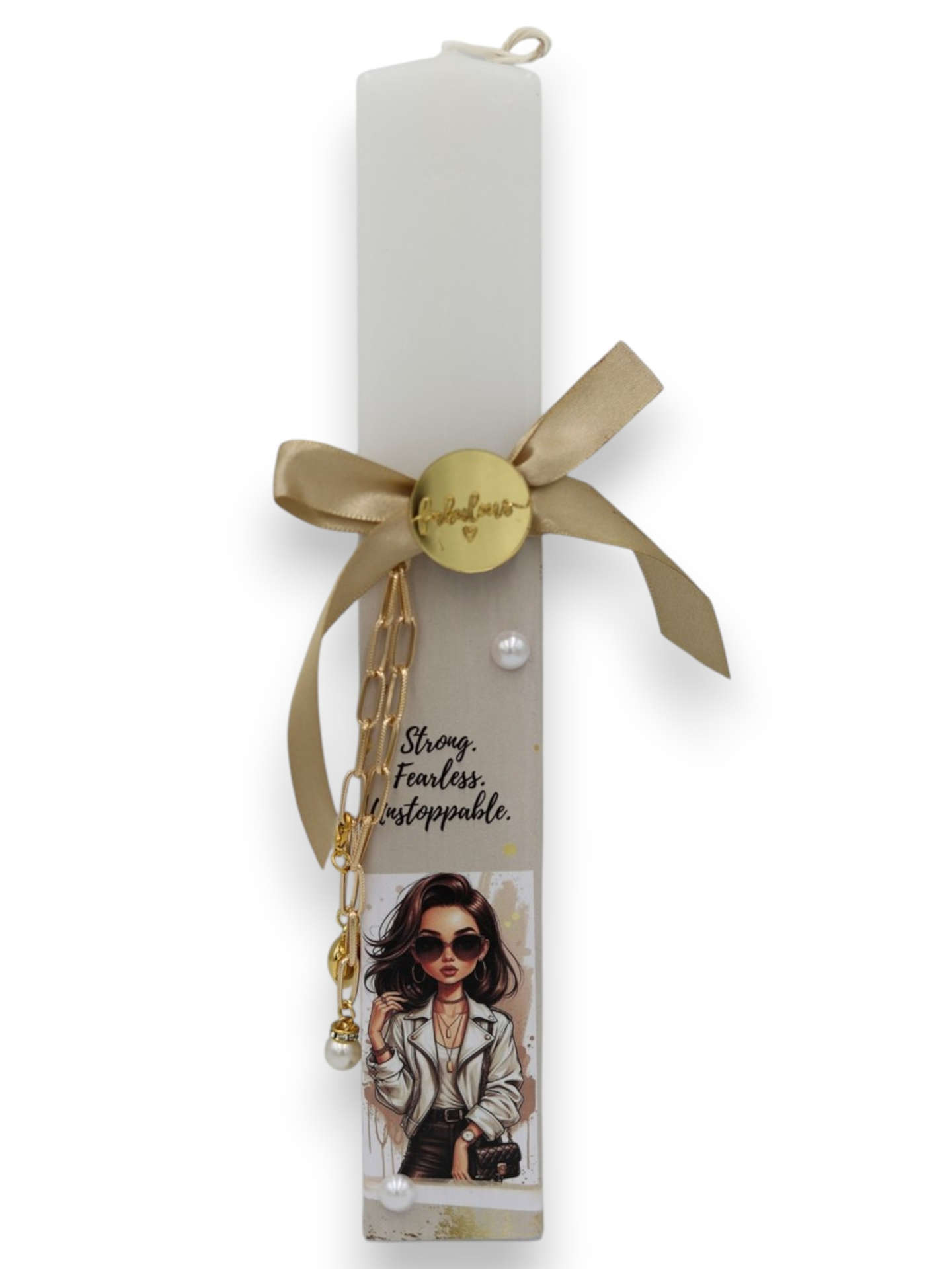 Χαρίστε στο βαφτιστήρι σας την πιο κομψή και δυναμική χειροποίητη πασχαλινή λαμπάδα, ιδανική για έφηβες και μεγαλύτερα κορίτσια που λατρεύουν τη μόδα! Αυτή η υπέροχη, λευκή πλακέ λαμπάδα ξεχωρίζει χάρη στη μοντέρνα εικονογράφηση ενός fashion girl και το empowering μήνυμα "Strong. Fearless. Unstoppable.". Ο προσεγμένος στολισμός της ολοκληρώνεται με έναν πολυτελή χρυσό σατέν φιόγκο, ένα χρυσό διακοσμητικό στοιχείο "Fabulous", διακριτικές πέρλες και ένα πανέμορφο χρυσό βραχιόλι-αλυσίδα, το οποίο το κορίτσι μπορεί να φορέσει ως ένα υπέροχο κόσμημα και μετά την Ανάσταση. Μια απόλυτα chic και ξεχωριστή επιλογή που σίγουρα θα κλέψει τις εντυπώσεις!