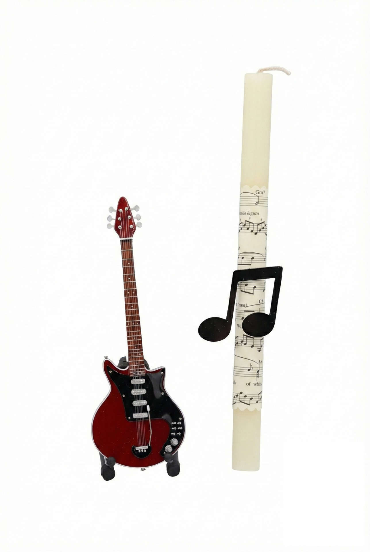 Μια ροκ πασχαλινή λαμπάδα, ιδανική για τους λάτρεις της μουσικής! Περιλαμβάνει κρεμ κερί διακοσμημένο με χαρτί παρτιτούρας και plexiglass νότα, και συνοδεύεται από μια εντυπωσιακή μινιατούρα ηλεκτρικής κιθάρας με τη δική της βάση στήριξης