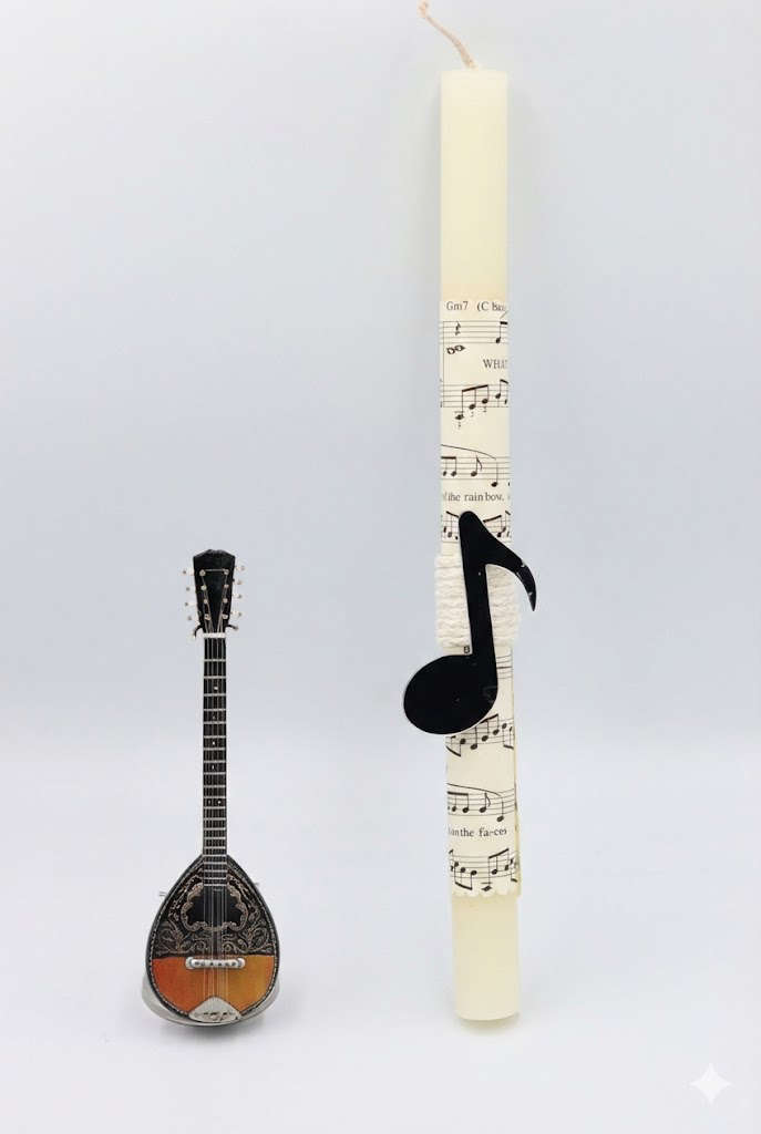 Μοναδική πασχαλινή λαμπάδα, ιδανική για τους φίλους της ελληνικής λαϊκής και παραδοσιακής μουσικής. Περιλαμβάνει κρεμ κερί διακοσμημένο με χαρτί παρτιτούρας και plexiglass νότα, καθώς και μια εξαιρετικά λεπτομερή μινιατούρα μπουζούκι σε δική της βάση.