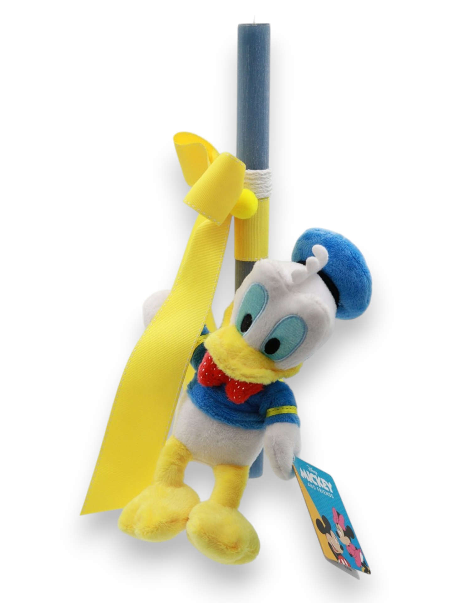 Χαρίστε στο βαφτιστήρι σας την πιο διασκεδαστική χειροποίητη πασχαλινή λαμπάδα, διακοσμημένη με τον πολυαγαπημένο ήρωα της Disney, τον Ντόναλντ Ντακ (Donald Duck)! Η κομψή γκριζομπλέ λαμπάδα στολίζεται υπέροχα με μια εντυπωσιακή, φαρδιά κίτρινη κορδέλα και κομψές λεπτομέρειες από λευκό κορδόνι. Το αυθεντικό λούτρινο παιχνίδι, με την κλασική ναυτική του στολή, το μπλε καπελάκι και το κόκκινο παπιγιόν, θα γίνει ο αχώριστος φίλος του παιδιού, προσφέροντας ατέλειωτες ώρες χαράς και παιχνιδιού μετά την Ανάσταση. Μια φανταστική και διαχρονική επιλογή που θα ενθουσιάσει κάθε μικρό αγόρι!