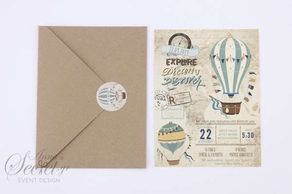 Προσκλητήριο βάπτισης για αγόρι με θέμα το travel boy, το αερόστατο και το ταξίδι με vintage στοιχεία.