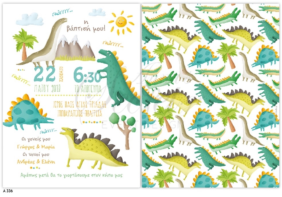 Προσκλητήριο βάπτισης της Lavly για αγόρια με θέμα τους δεινόσαυρους με φάκελο σε χρώμα της επιλογής σας. Το προσκλητήριο είναι μονόκαρτο με εκτύπωση και στις 2 όψεις. Διαστάσεις προσκλητηρίου : 15 x 20 cm