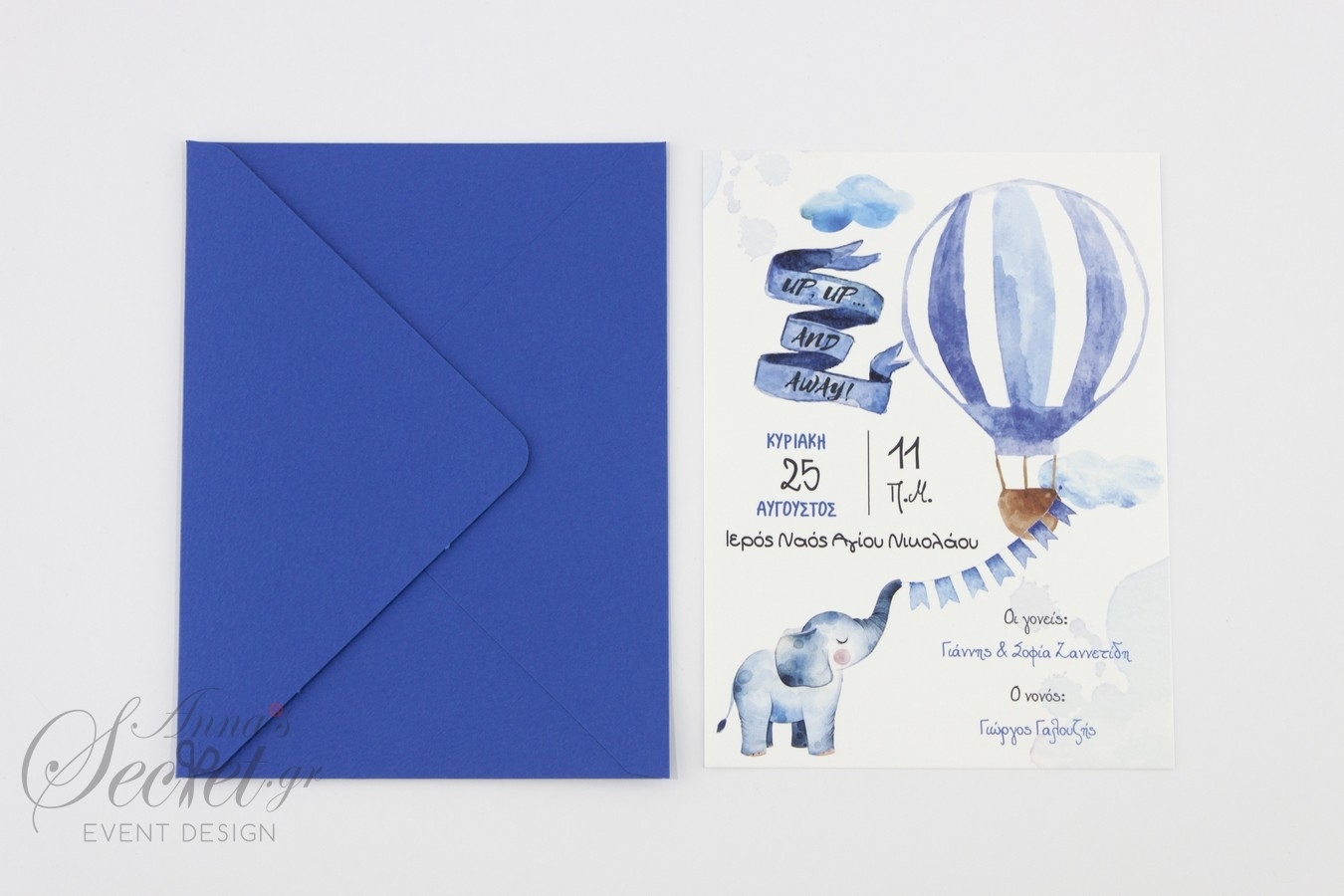 Προσκλητήριο βάπτισης για αγόρι με θέμα το ελεφαντάκι και το αερόστατο σε μπλε αποχρώσεις.
