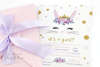 Το προσκλητήριο διαθέτει φάκελο διάστασης 19.5Χ14.5cm σε baby pink περλέ χαρτί 300γρ με σχισμές για κλείσιμο με κορδέλα. Η κεντρική κάρτα του προσκλητηρίου είναι τυπωμένη σε λευκό περλέ χαρτί 300γρ.