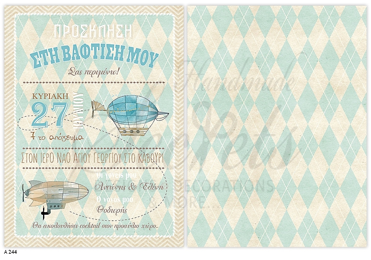 Ιδιαίτερο προσκλητήριο βάπτισης για αγοράκι με θέμα το αερόστατο, με φάκελο σε χρώμα της επιλογής σας. Το προσκλητήριο είναι μονόκαρτο με εκτύπωση και στις 2 όψεις. Διαστάσεις προσκλητηρίου:15 x 20 cm – Kωδικός : A244
