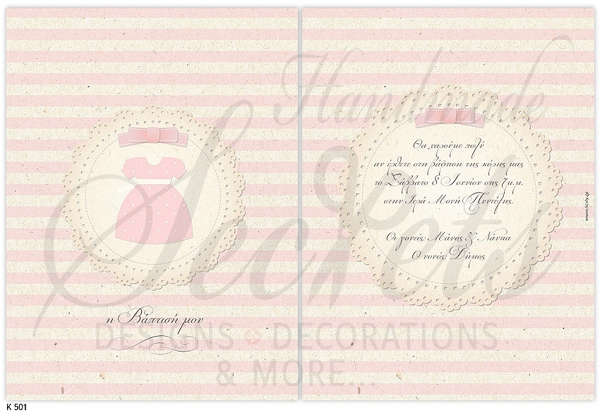 Ρομαντικό προσκλητήριο βάπτισης για κοριτσάκι με φόρεμα, με φάκελο σε χρώμα της επιλογής σας. Το προσκλητήριο είναι μονόκαρτο με εκτύπωση και στις 2 όψεις. Διαστάσεις προσκλητηρίου:15 x 20 cm – Kωδικός : K501