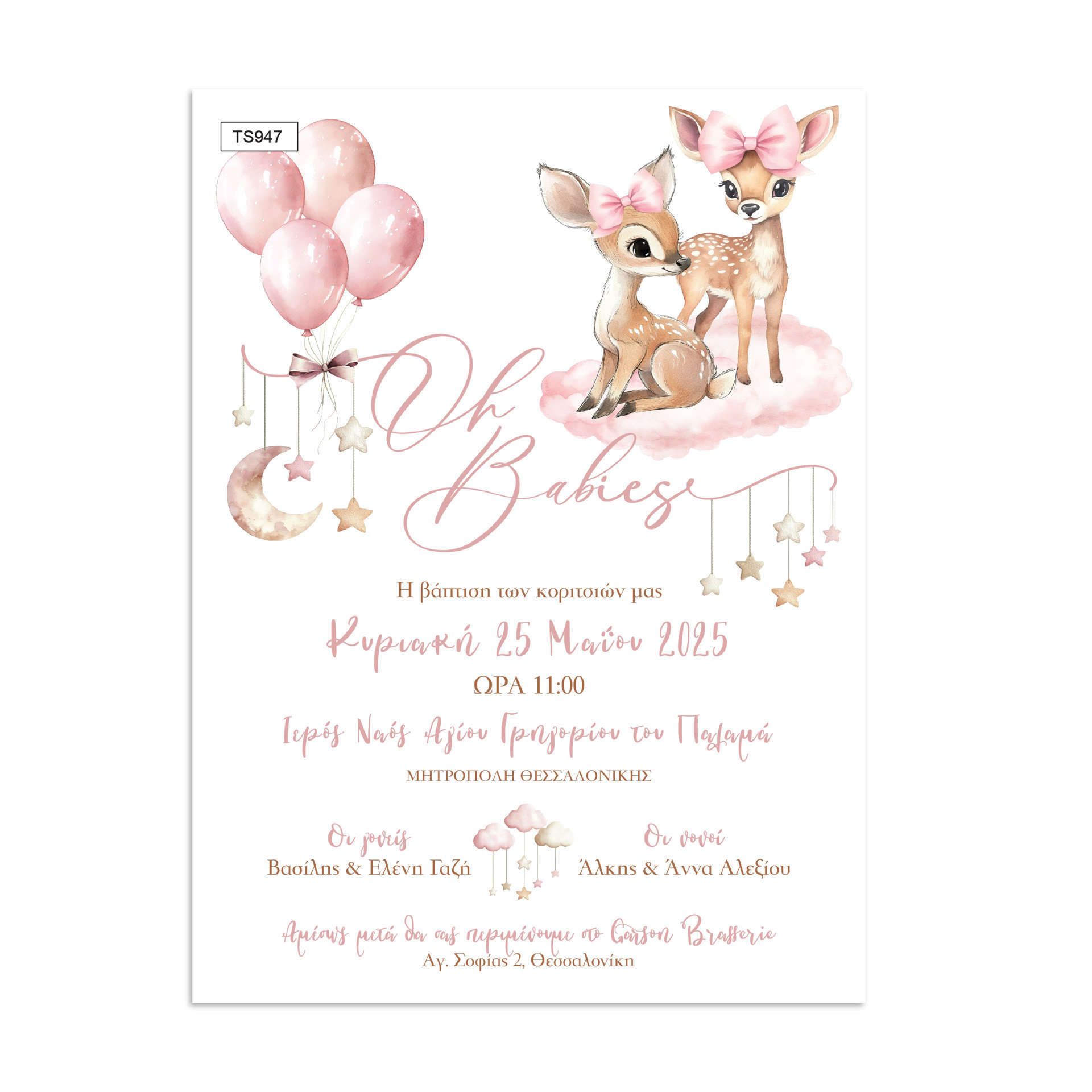 Γλυκά προσκλητήρια βάπτισης για δίδυμα κοριτσάκια με θέμα ελαφάκια. Ρομαντικά σχέδια, απαλά χρώματα και προσωποποίηση για μια αξέχαστη πρόσκληση.