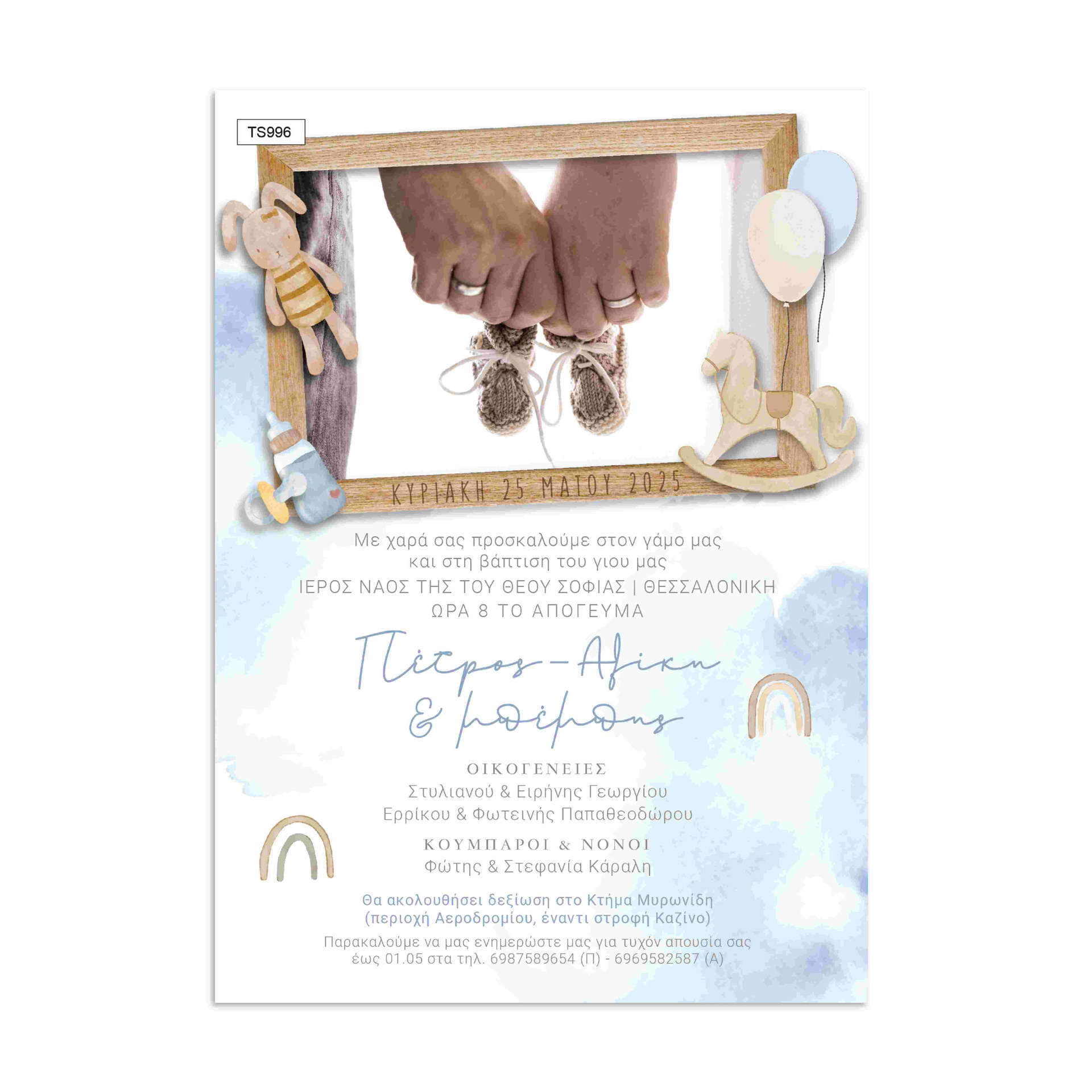 Τρυφερό προσκλητήριο γάμου και βάπτισης με φωτογραφία, baby στοιχεία και απαλές γαλάζιες αποχρώσεις. Ρομαντικό και ζεστό σχέδιο για μια μοναδική οικογενειακή στιγμή.