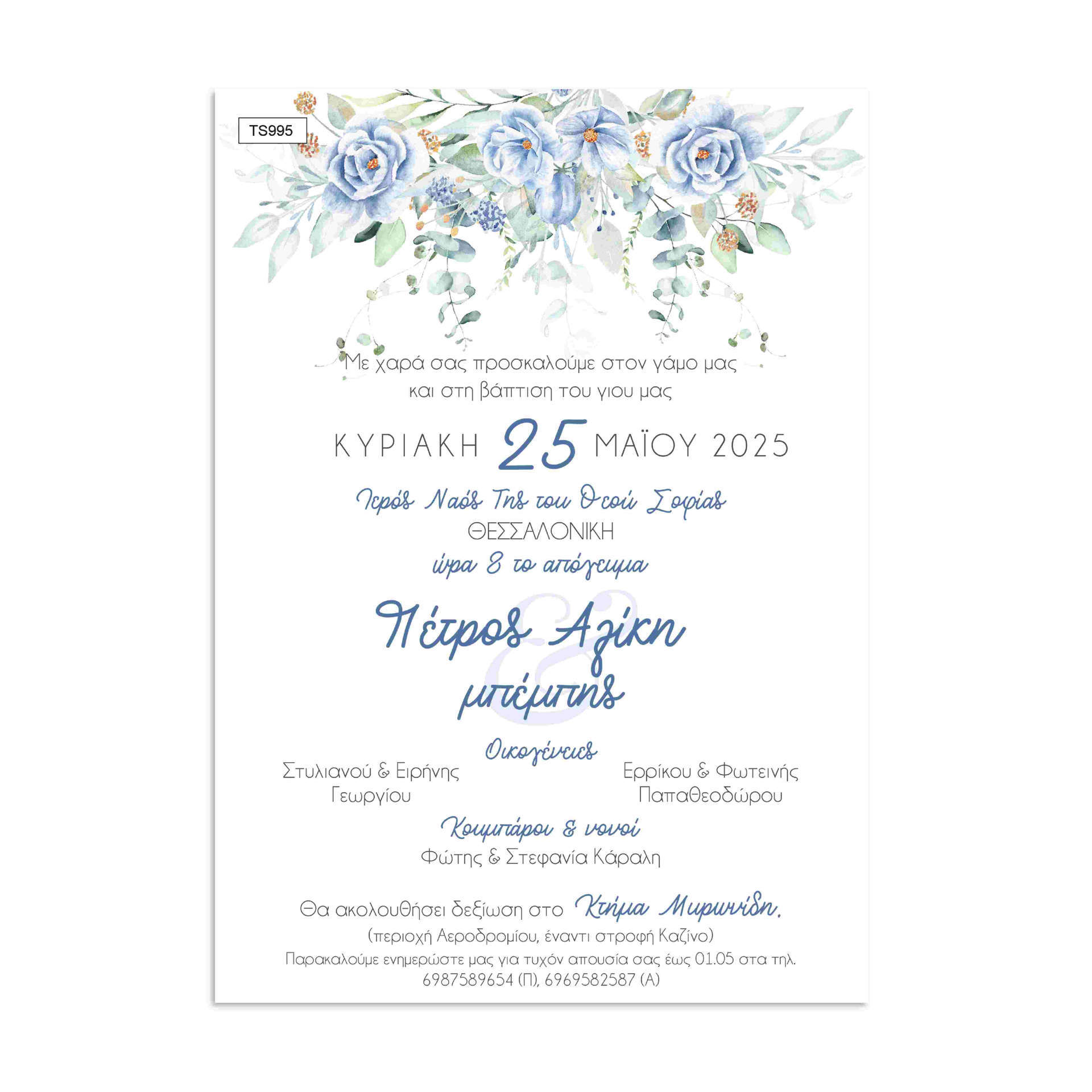 Κομψό προσκλητήριο γάμου και βάπτισης με watercolor λουλούδια σε απαλές μπλε αποχρώσεις. Ρομαντικό και elegant σχέδιο για ενα ξεχωριστό και διαχρονικό μυστήριο