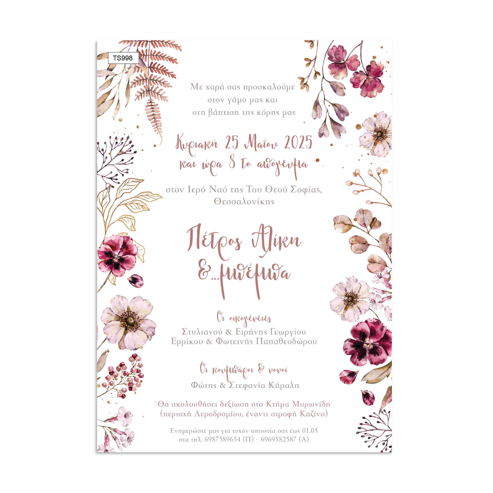 Ρομαντικό προσκλητήριο γάμου και βάπτισης με watercolor λουλούδια σε απαλές ροζ και nude αποχρώσεις. Κομψό floral σχέδιο για μια διαχρονική και ξεχωριστή στιγμή.