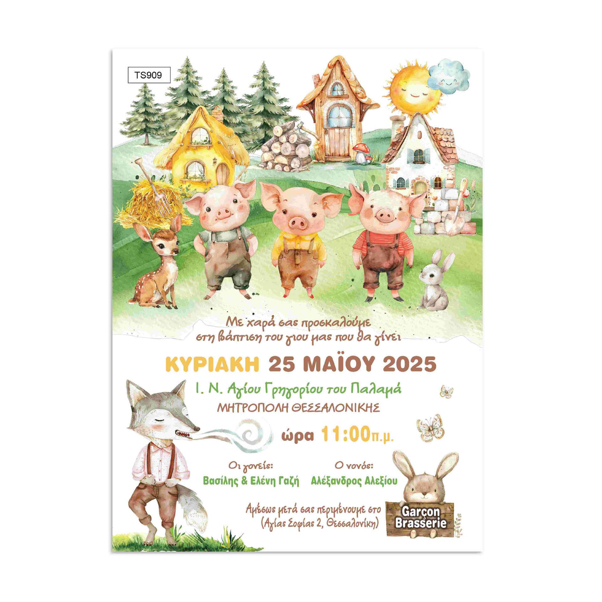 Προσκλητήριο βάπτισης για αγόρι με θέμα τα 3 γουρουνάκια και τον λύκο. Παραμυθένιο, χαριτωμένο και ιδανικό για ξεχωριστή βάπτιση.