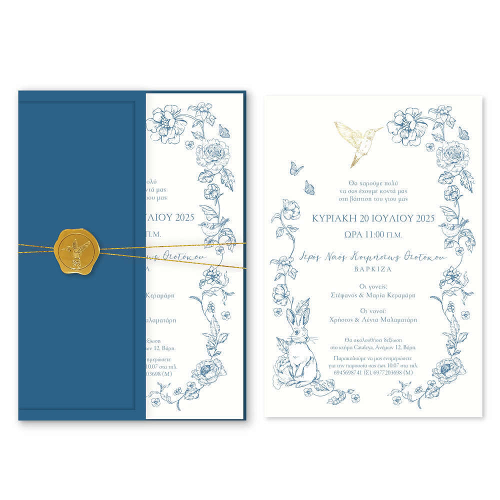 Το προσκλητήριο βάπτισης για αγόρι “Blue Royal Ornamental” αποπνέει μια αίσθηση διαχρονικής κομψότητας και αριστοκρατικής πολυτέλειας. Το σχέδιο χαρακτηρίζεται από τις λεπτεπίλεπτες εικονογραφήσεις σε στυλ vintage γκραβούρας, που περιλαμβάνουν ανθισμένα μοτίβα, πουλιά και μικρές πεταλούδες σε μια υπέροχη dusty blue απόχρωση. Η παρουσίαση απογειώνεται με τον ιδιαίτερο φάκελο σε βαθύ royal μπλε χρώμα, ο οποίος κλείνει με χρυσό κορδόνι και ένα εντυπωσιακό χρυσό βουλοκέρι που απεικονίζει ένα πουλί, προσδίδοντας έναν αέρα μοναδικότητας και υψηλής αισθητικής. Η καθαρή τυπογραφία στο εσωτερικό συμπληρώνει το σύνολο, καθιστώντας το ιδανικό για γονείς που επιθυμούν μια βάπτιση με ρομαντικό και ταυτόχρονα "βασιλικό" χαρακτήρα. Εκτυπωμένο σε χαρτί εξαιρετικής ποιότητας με ματ υφή, το Blue Royal Ornamental είναι κάτι παραπάνω από ένα προσκλητήριο· είναι ένα ενθύμιο που προδιαθέτει τους καλεσμένους σας για μια τελετή γεμάτη φινέτσα και καλαισθησία.