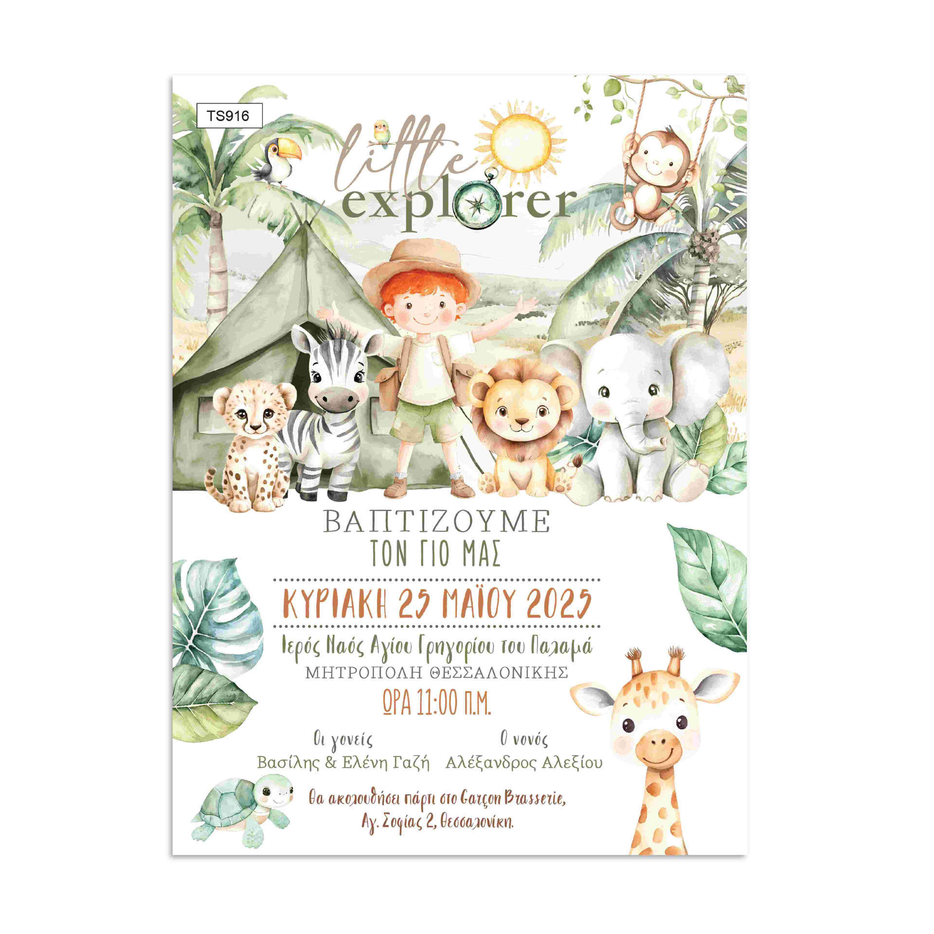 Προσκλητήριο βάπτισης για αγόρι με θέμα μικρός εξερευνητής και ζωάκια. Περιπετειώδες, παιδικό και ιδανικό για ξεχωριστή βάπτιση.