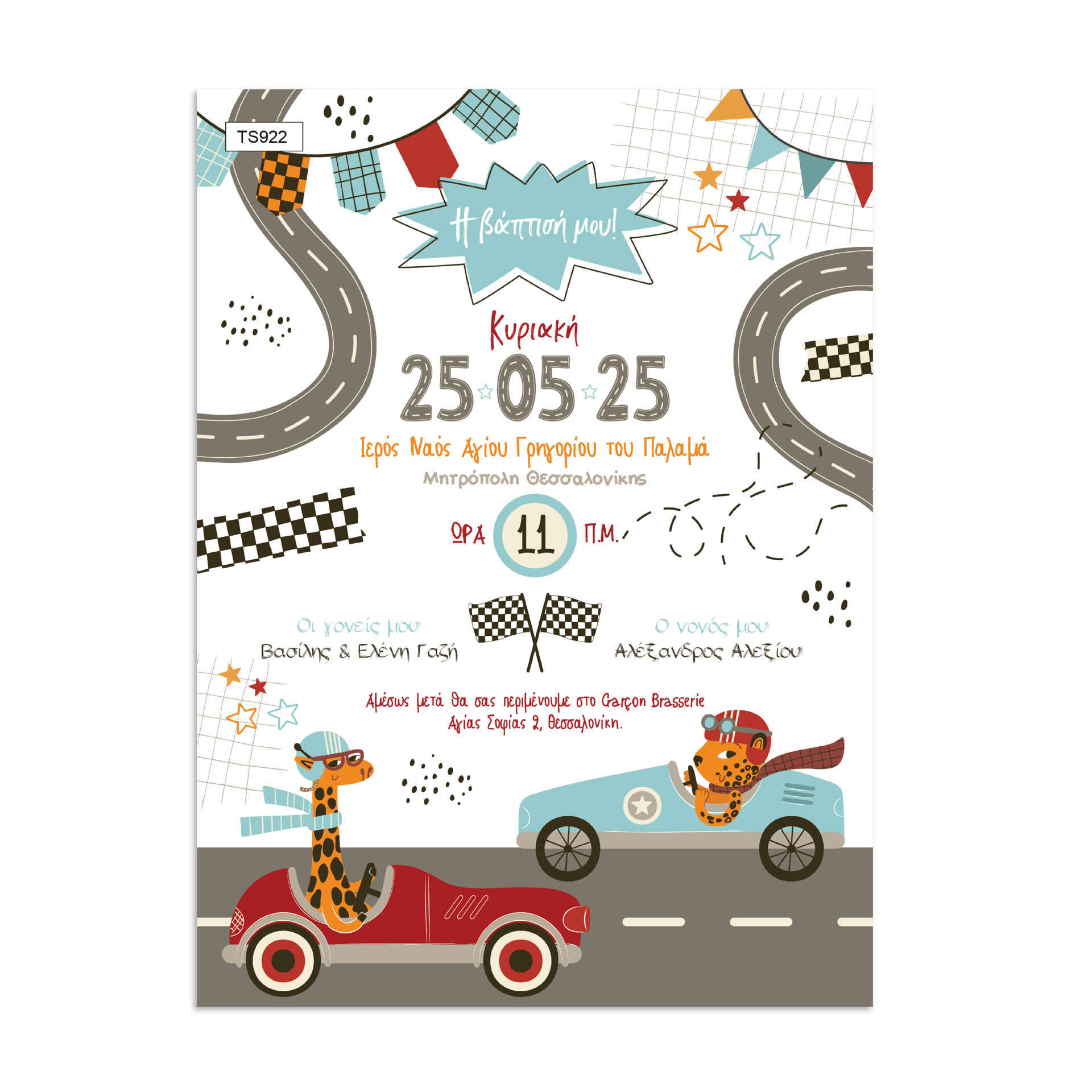Ένα χαρούμενο και παιχνιδιάρικο προσκλητήριο βάπτισης για αγόρι με θέμα τα αγωνιστικά αυτοκίνητα (Race Cars), ιδανικό για μικρούς λάτρεις της ταχύτητας και της περιπέτειας. Το σχέδιο περιλαμβάνει δρόμους, καρό σημαίες, αυτοκινητάκια και χαριτωμένα ζωάκια–οδηγούς, δημιουργώντας ένα ζωηρό και διασκεδαστικό αποτέλεσμα. Οι έντονες αλλά ισορροπημένες αποχρώσεις, τα γραφικά στοιχεία που θυμίζουν αγωνιστική πίστα και το μοντέρνο ύφος κάνουν το προσκλητήριο ιδανικό για βάπτιση με θεματική cars – racing – παιχνίδι. Το κείμενο προσαρμόζεται πλήρως με τα στοιχεία της βάπτισης, ενώ η εκτύπωση υψηλής ποιότητας εξασφαλίζει άριστο αισθητικό αποτέλεσμα. Ένα προσκλητήριο που τραβά αμέσως τα βλέμματα και δίνει από την πρώτη στιγμή τον τόνο για μια χαρούμενη και ξεχωριστή βάπτιση αγοριού.